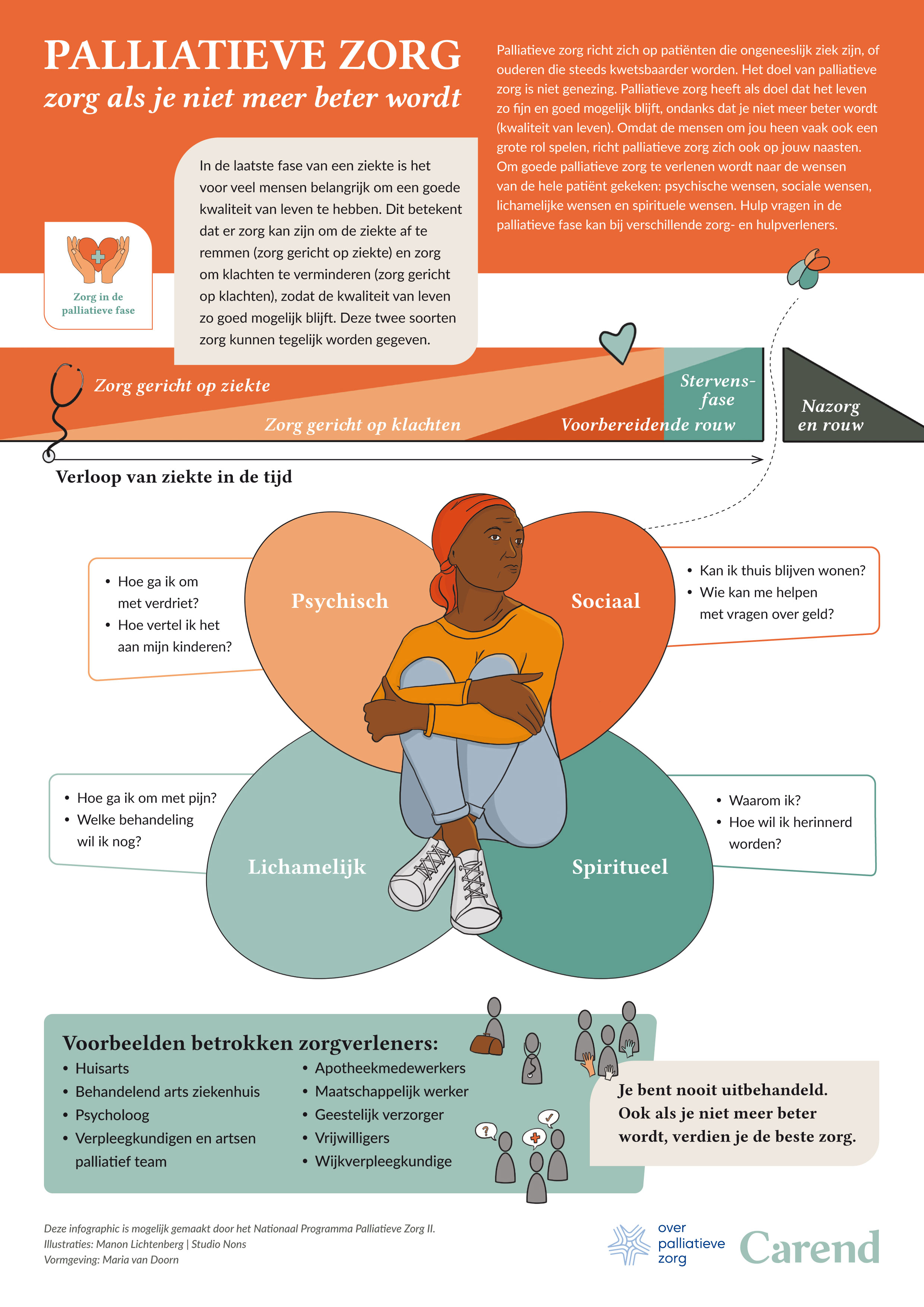 Carend en de website Overpalliatievezorg ontwikkelen 26 infographics over verschillende onderwerpen in de palliatieve zorg. Verspreid over de onderwerpen zullen alle domeinen binnen de palliatieve zorg aan bod komen. Bij het ontwikkelen van de infographics zijn patiënten en naasten betrokken.